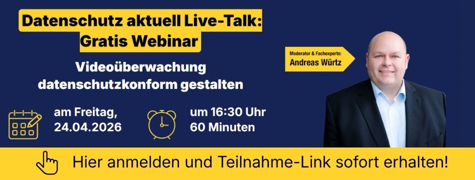 Jeweils am letzten Freitag im Monat, 16:30-17:30 Uhr, haben Sie die Möglichkeit, sich persönlich im "Datenschutz aktuell Live Talk" mit Rechtsanwalt und Chefredakteur von "Datenschutz aktuell", Andreas Würtz auszutauschen.