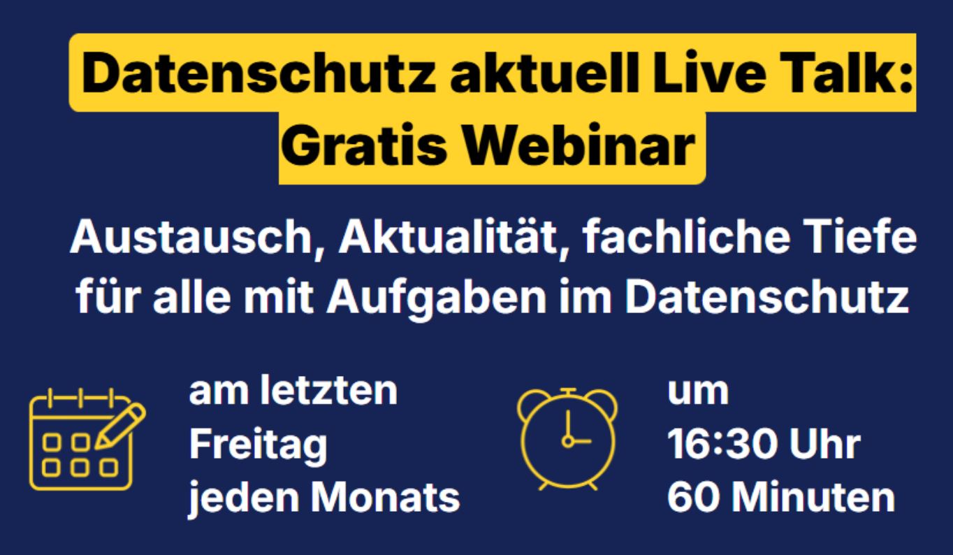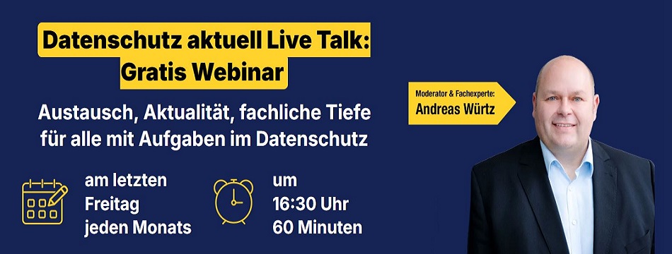 Jeweils am letzten Freitag im Monat, 16:30-17:30 Uhr, haben Sie die Möglichkeit, sich persönlich im "Datenschutz aktuell Live Talk" mit Rechtsanwalt und Chefredakteur von "Datenschutz aktuell", Andreas Würtz auszutauschen.